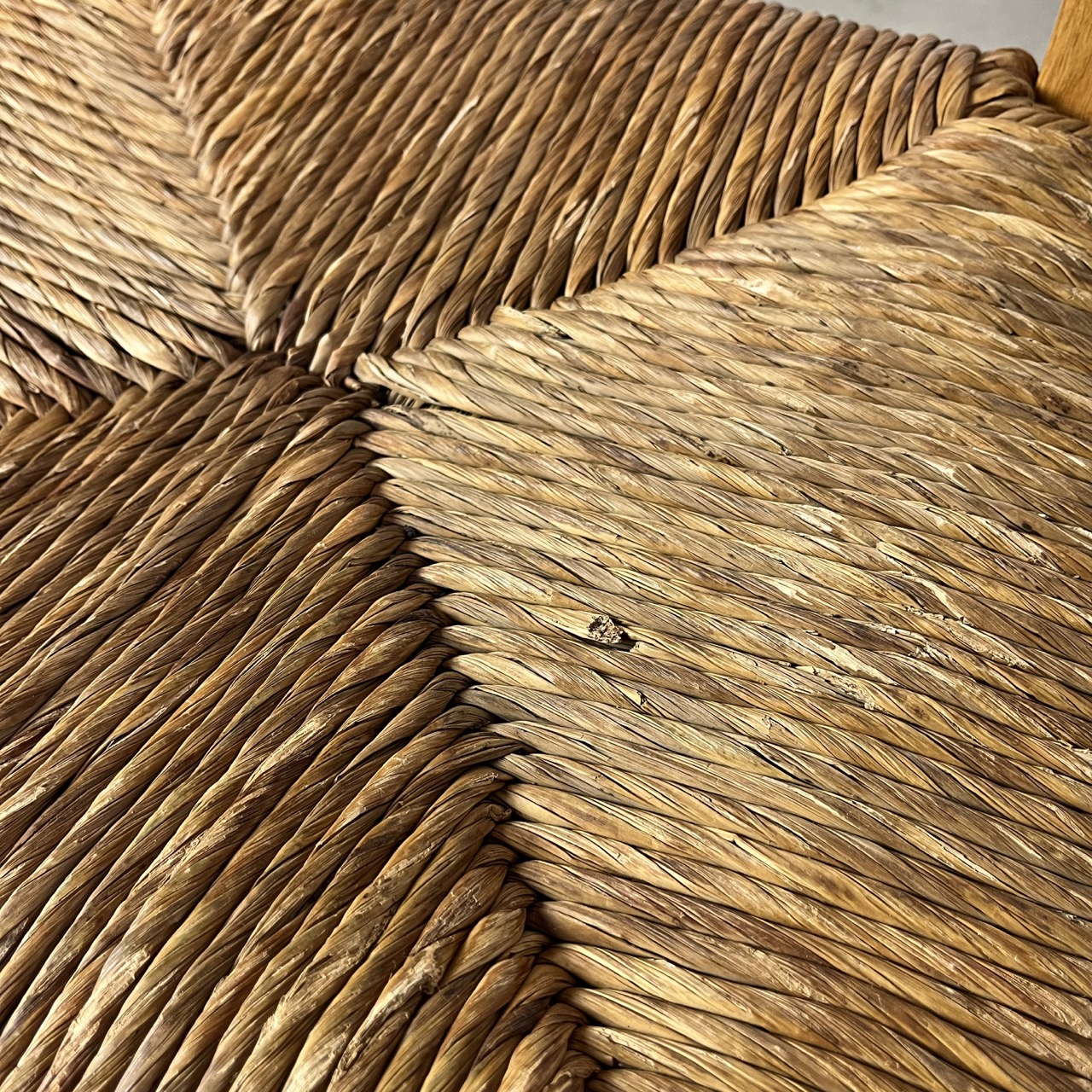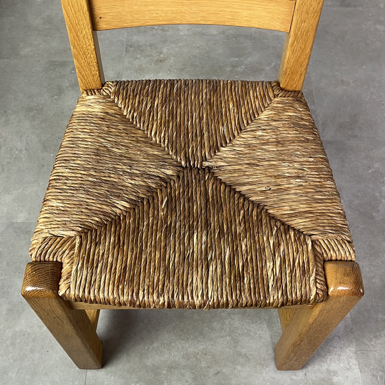 French dining chairs presents a striking combination of rustic design and natural materials. Each chair features a heavy oak wooden frame, meticulously crafted to highlight the natural grain and inherent strength of the wood. The imposing presence of the oak is softened by the intricate rush seating, which offers a contrasting texture and an organic feel.