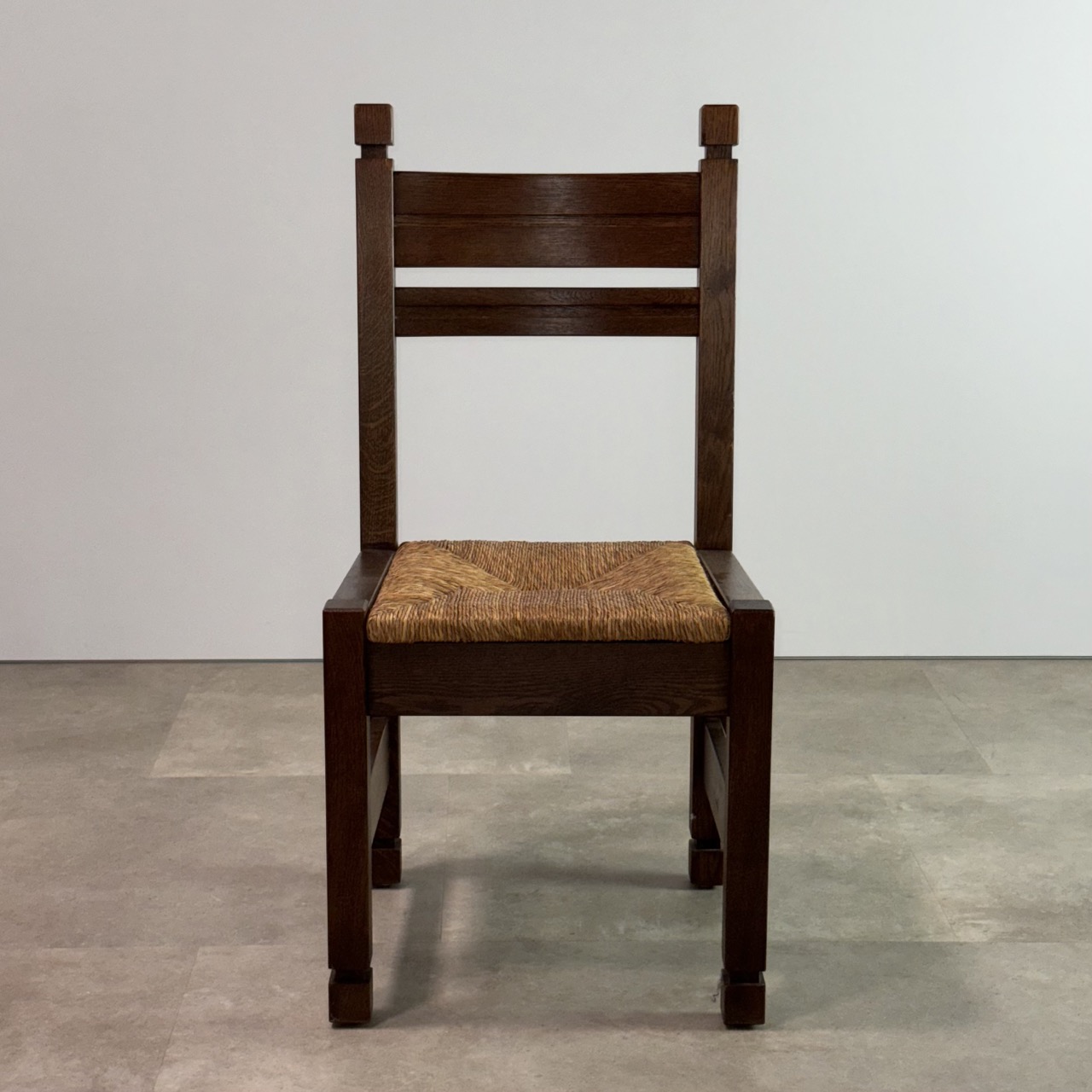 A set of six French rustic dining chairs in oak and rush. Straight lines, dito details. Seat height 44 cm. Sold as a set.